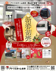 1月24日(土)25日(日)の二日間で アトリエホーム会津・郡山店”新春”合同企画 「ショールームからはじまる家づくり相談会」を開催いたします! 「パナソニックショウルーム郡山」にて、最新の住宅設備を見学・体感しながら、 アトリエホームの新築・リフォームについて、住まいのお困りごとをなんでもご相談ください。 現地MAP 福島県郡山市富田町稲川原45−1![]()