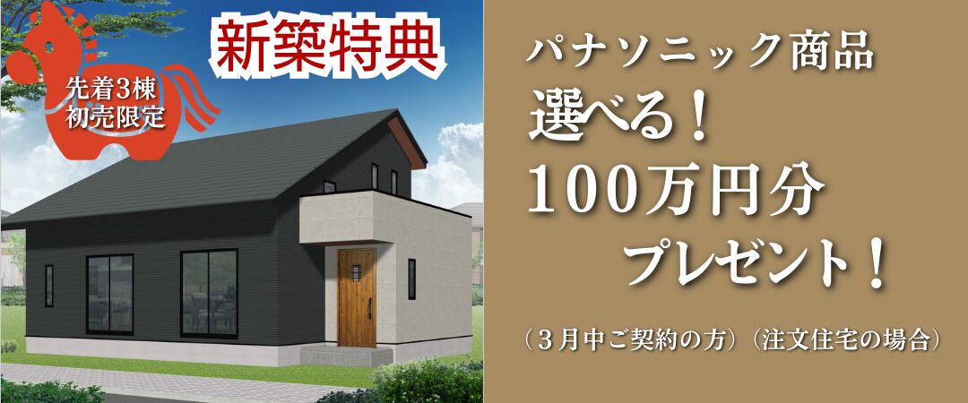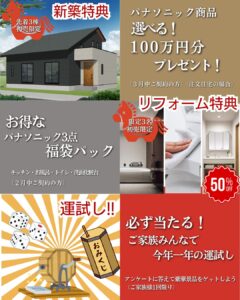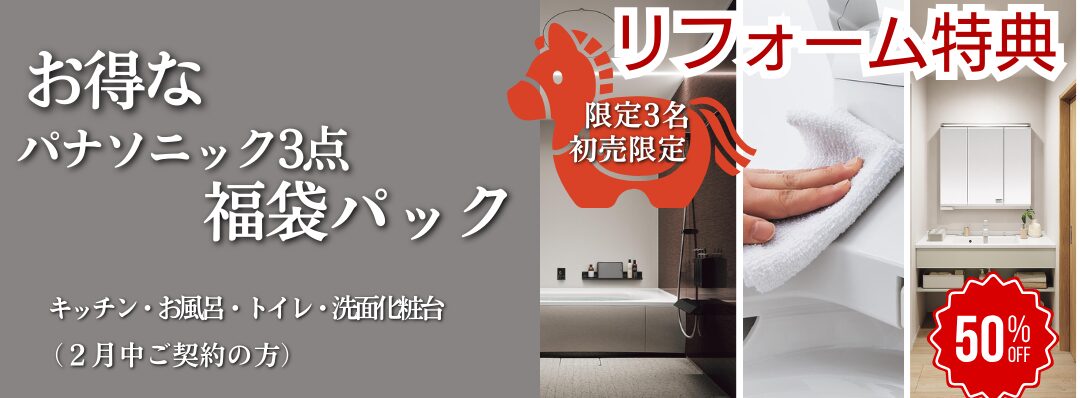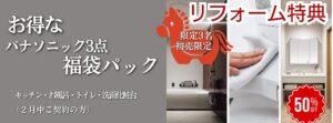 3、リフォーム特典 2026年2月末までに当社でリフォームの 請負契約をいただいたお客様には、 パナソニック設備3点セット (商品代50%OFF)